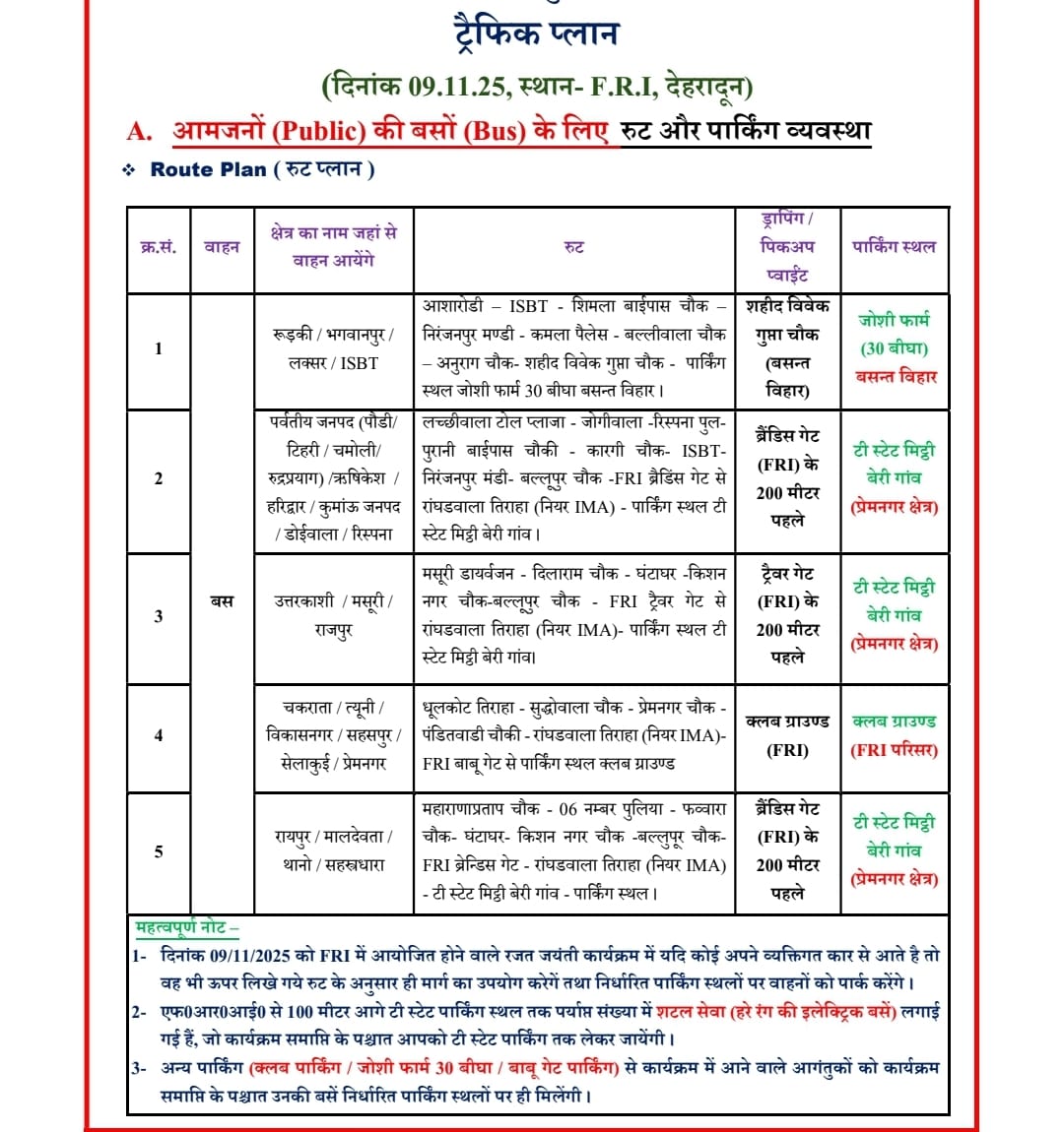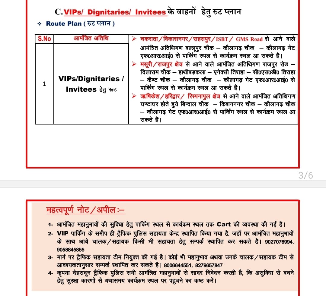 दून पुलिस द्वारा जारी प्लान के अनुसार, एफआरआई के 500 मीटर दायरे को जीरो जोन घोषित किया गया है। इस क्षेत्र में किसी भी सामान्य वाहन की एंट्री नहीं होगी। यह ट्रैफिक प्लान सुबह 6 बजे से रात 8 बजे तक प्रभावी रहेगा, जबकि डायवर्जन प्लान शाम 4 बजे तक लागू रहेगा।