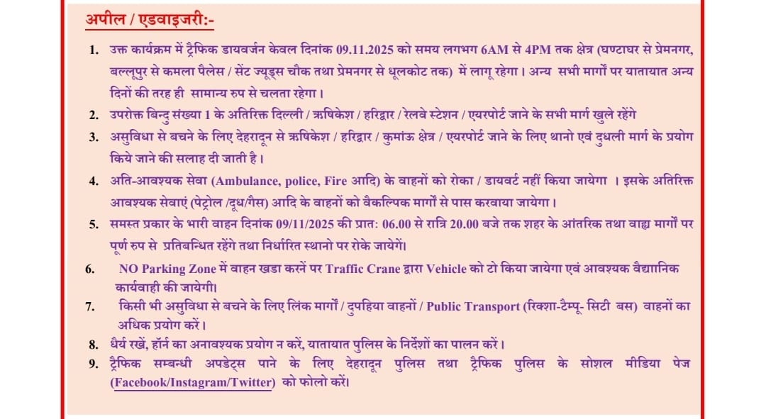 इस अवधि में भारी वाहनों का प्रवेश शहर के अंदर और बाहर दोनों ही मार्गों पर पूरी तरह प्रतिबंधित रहेगा। चकराता रोड के रास्ते एफआरआई जाने वालों के लिए वैकल्पिक रूट तय किए गए हैं ताकि उन्हें किसी असुविधा का सामना न करना पड़े।